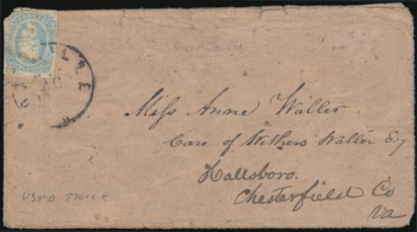 4984 7 image7 (Horiz pair), Pen cancelled on cover addr to Danville Va. The cover then was re-used with #11a cancelled at Danville to Hallsboro Va. VG+, some flts. A RARE CONFEDERATE TURNED COVER (Image) Estimate 500.00+ $Cdn