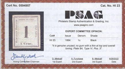 4989 23 image23, Beautiful unused 1¢ black Numeral on laid paper (Plate 8A, Type IV, Pos 3). VF appearance with four large margins, NG, small thin at top, light overall toning. Has 2022 PSAG Certificate (Image) (View Certificate)