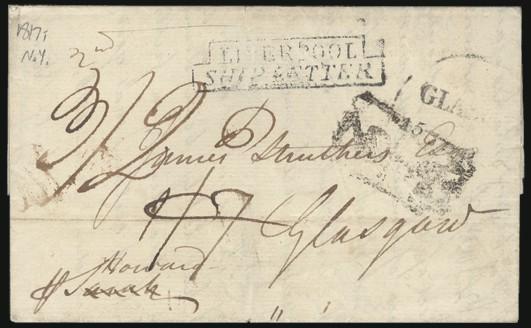 4994   imageStampless folded Trans-Atlantic letter dated New York 3 Dec 1817 to Glasgow. Has boxed step type "LIVERPOOL / SHIP LETTER" h/s & Glasgow receiver, plus various m/s rates. F (Image) Estimate 150.00+ $Cdn
