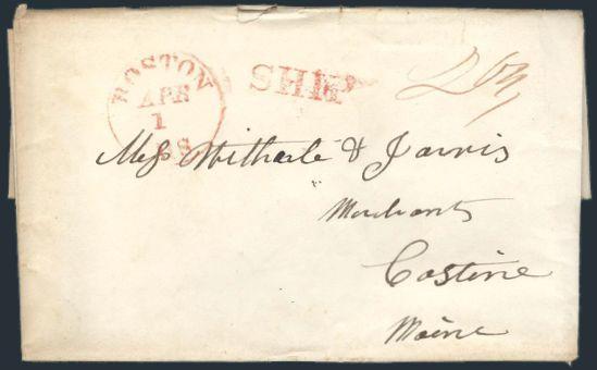 4997   imageStampless folded letter from Liverpool datelined 31 Jan, 1828 to Costine Maine. Has red "SHIP" h/s and Boston 1 Ap CDS. F (Image) Estimate 90.00+ $Cdn