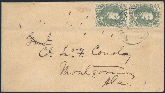 4981 1 image1 (Imperf pair), Tied by 1863 Yorktown, Virginia CDS on cover to a Confederate Officer in Montgomery, Alabama. F, upper stamp has a rounded corner. Attractive cover (Image) Estimate 300.00+ $Cdn