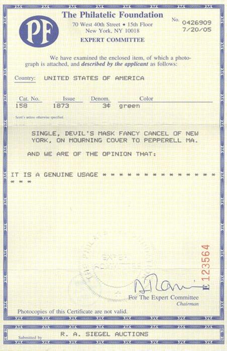 Banknote 3¢ green tied by a DEVIL'S MASK fancy cancel of New York on a mourning cover, addr to Pepperelle Mass. The cover is in nice condition and the cancel is a lovely clear strike. VF. Has 2005 Philatelic Foundation Certificate. Ex Siegel (Image) (View Certificate)