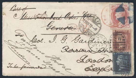 by blue cork & red transit cancels on neat 1872 Trans-Atlantic cover addr to London England (rec CDS 17 July 1872). Then forwarded with Gr. Britains #'s 29 and 33 to GENEVA SWITZERLAND (rec cancel) & re-forwarded back to London. Has various markings