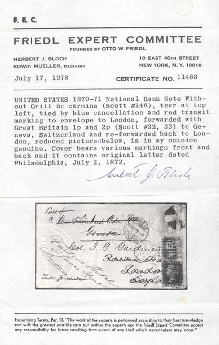 on the front & reverse side. F (#148 has small sealed tear). Has 1978 Friedl Expert Committee Certificate. A NICE COVER! (Image) (View Certificate)