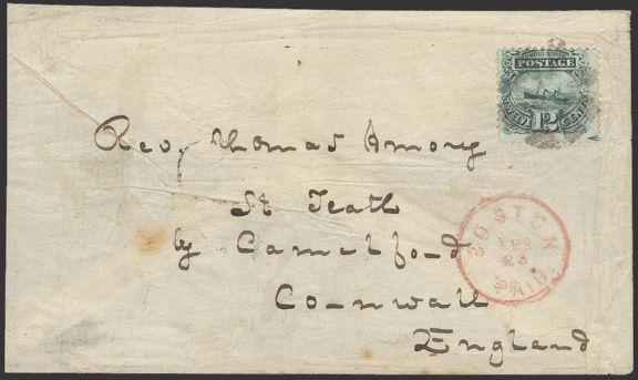 to 1870 Trans-Atlantic cover with red Boston Paid cancel, addr to Cornwall England. Has 3 diff b/s's. F (Image)