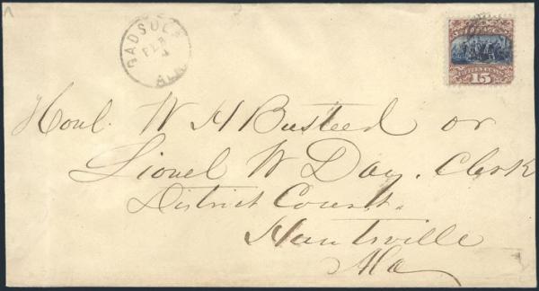 by target cancel on cover circa 1870 with Gadsden, Ala 4 Feb CDS, to Huntsville, Ala. F, small edge tear in cover, slightly reduced. Scarce (Image)