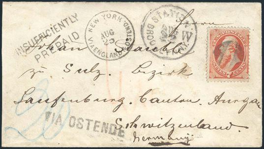 cork cancel on Trans-Atlantic cover to Switzerland. Has Brooklyn, NY / Station / W cancel, NEW YORK / VIA ENGLAND & OSTEND & Basel transits. Plus "INSUFFICIENTLY / PREPAID" & "VIA OSTENDE" h/s's & Laufenburg 7 Sept 1874 receiver. F-VF. A NICE COVER (Image)