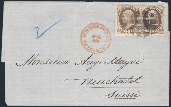 148, Tied by blue target & crayon cancels on Trans-Atlantic cover to AARAN, SWITZERLAND. Has red NEW YORK PAID ALL / VIA ENG & OSTd 25 Apr (1874) & Basel transits. VF