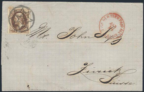 by attractive Star within Star New York Foreign Mail cancel on folded Trans-Atlantic cover to SWITZERLAND. Has red NEW YORK PAID ALL / VIA ENG & OSTd & Basel transits & Zurich 26 Jan 1874 receiver. F-VF (Image)