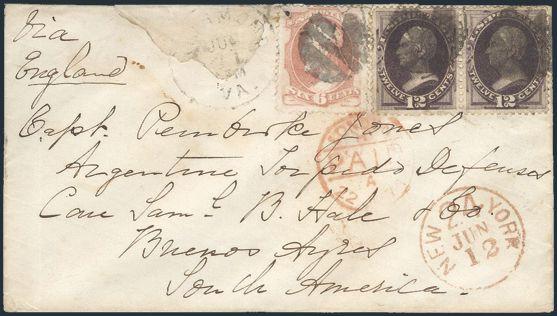 (Pair), Tied by Richmond Va & cork cancels on twice Trans-Atlantic 1875 cover via New York & London. Addr to Capt Pembroke Jones, Argentine Torpedo Defences, Buenos Aires, Argentina (23 July 1875 b/s). Capt Jones was the oldest graduate at USN