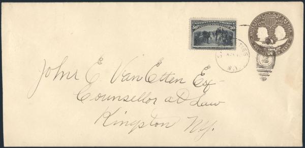 Columbian 50¢ neatly tied by Saugerties NY 12 Nov duplex on 10¢ Columbian Postal Stationery envelope (#U351). Addr to Kingston NY. VF, a bit reduced. Scarce (Image)