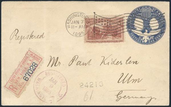 Columbian High Value neatly tied by Washington DC 7 Jan, 1895, waving Flag cancel on Reg'd (U348) 1¢ blue Columbian Postal Stationery envelope to ULM, GERMANY (rec b/s 22 Jan '95). Has New York City Registry label. VF, vertical crease in cover well
