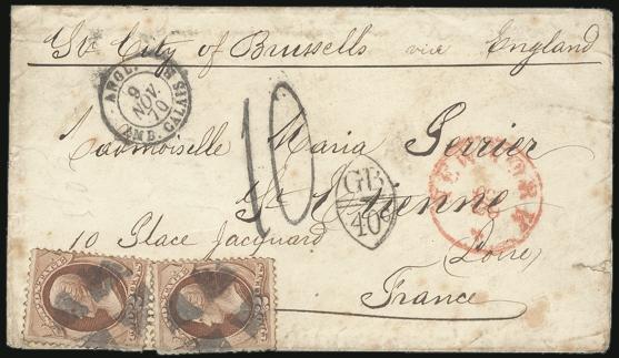 With segmented cork cancels on Trans-Atlantic cover with red New York 28 Oct (1870) CDS to France. Has Steamer "City of Brussells" m/s, "10" m/s rate, "GB/40¢" oval strike, London & Calais transits & St. Etienne 11 Nov b/s. VG+, some soiling /
