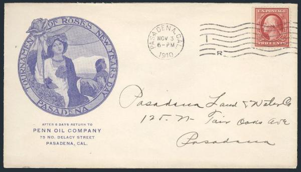 by Pasadena, Calif 3 Nov 1910 cancel on local blue illustrated advertising cover for Penn Oil Co. Depicts a Roman girl holding a rose. VF (Image)