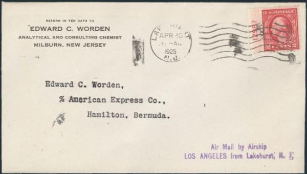 number single), Tied on cach Airship LOS ANGELES Lakehurst to Bermuda 20 Apr 1925 flight cover (addr to Bermuda). VF (Image)