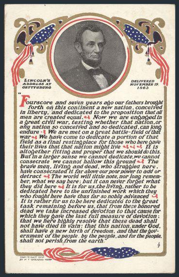 Lincoln 2¢ tied by Chicago 27 Feb, 1909 cancel on coloured patriotic postcard. Depicts a portrait of ABRAHAM LINCOLN & his famous GETTYSBURG ADDRESS. VF (Image)