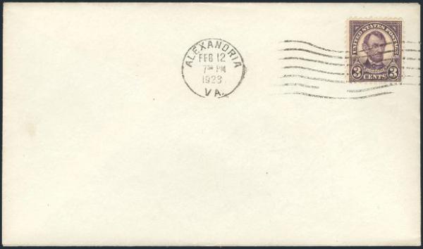 by Alexandria Va 12 Feb, 1923 cancel on unaddr FDC. VF. THIS IS A SCARCE UNOFFICIAL CITY FOR A FIRST DAY (Image)