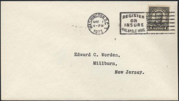 by Washington, DC 1 May 1923 slogan cancel on "Worden" FDC to Millburn, NJ. VF (Image)