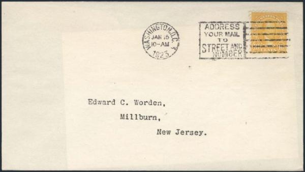 by Washington, DC 15 Jan 1923 slogan cancel on "Worden" FDC to Millburn, NJ. VF (Image)
