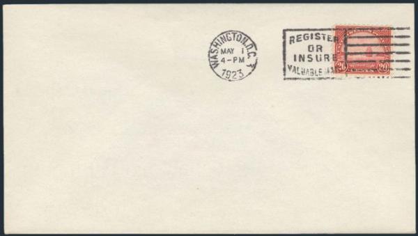 by Washington, DC 1 May 1923 slogan cancel on FDC. VF, unaddr. Scarce (Image)