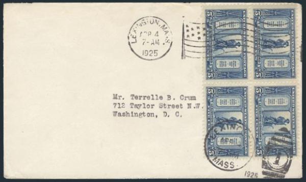Complete set of Lexington-Concord blocks neatly tied by matching Lexington Mass 4 April, 1925 cancels on separate FDC's. VF. A PRETTY SET OF BLOCK FDC's (3 covers)