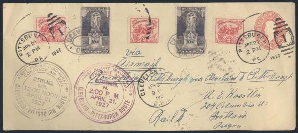 629 (3), Tied on 4¢ postal stat envelope with double cachets for Pittsburgh to Cleveland & RETURN FFC 21 Apr 1927. F-VF. Eye-catching item! (Image)