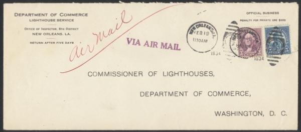 Tied by New Orleans 19 Feb 1934 duplex cancel on "Commissioner of Lighthouses, Dep't of Commerce, Washington, D.C." large size airmail business reply envelope with Dep't of Commerce / Lighthouse service corner card. F, edge tear. Interesting (Image)