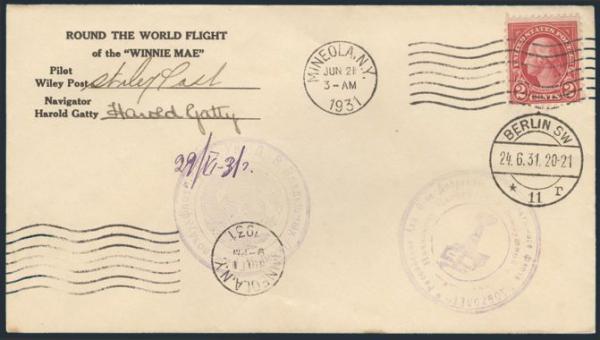 by Mineola NY 21 June, 1931 machine cancel on WILEY POST/HOWARD GATTY ROUND THE WORLD cach cover. The famous American pilot Wiley Post accompanied by his navigator Harold Gatty made a record round the world flight in their airplane "Winnie Mae". Has