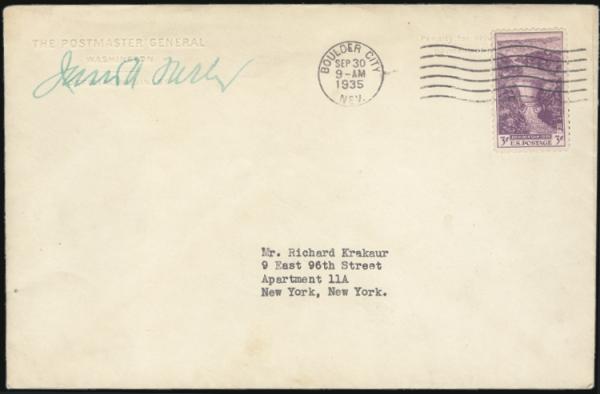 by Boulder City, Nev 30 Sept 1935 cancel on large size FDC to New York. Has "THE POSTMASTER GENERAL / WASHINGTON / Official BUSINESS" embossed corner card & is AUTOGRAPHED JAMES A. FARLEY (Postmaster General). Has related new issue notice enclosure.