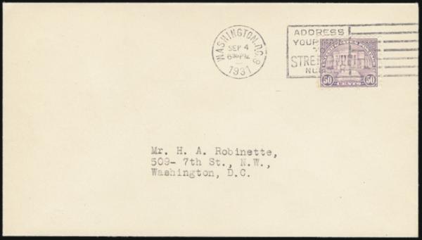 Arlington 50¢ tied on FDC by Washington, DC 4 Sept 1931 slogan cancel. VF. Scarce (Image)