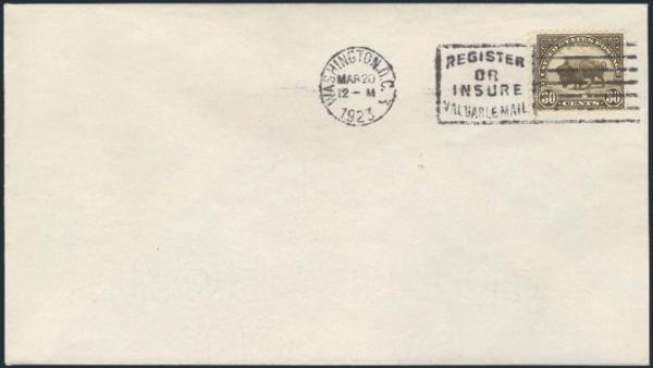 by Washington, DC 20 Mar 1923 slogan cancel on FDC. VF, unaddr. Scarce (Image)