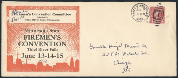 by Thief River Falls, Minn 7 June 1932 duplex cancel on red illustrated #10 size Minnesota Firemen's Convention special event cover. F-VF (Image)