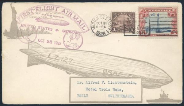 Paying $1.05 rate tied by Varick St Sta, NY 27 Oct, 1928 slogan cancel on cach GRAF ZEPPELIN First Flight cover (Friedrichshafen b/s). The cover has a beautiful large size illustration of the Graf Zeppelin and is addr to one of the world's most