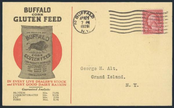by Buffalo NY 21 Apr 1926 cancel on beautiful illustrated advertising postcard for Buffalo Corn Gluten Feed. VF (Image)