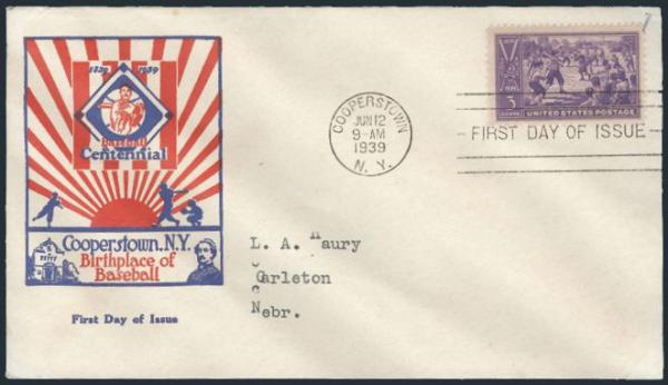 Baseball 3¢ issue tied on Leatherstocking Stamp Club cacheted FDC. VF (Image)