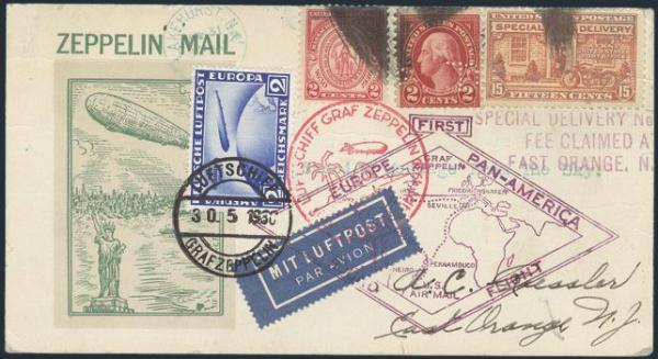 (Perfin), 682, E16; Also Germany #C38 (2 Mark South America Zeppelin), Tied on cach GRAF ZEPPELIN First Europe - Pan American Round Flight postcard addr to Roessler, Special Delivery. Better German Airmail is tied by ON BOARD cancel. This is the
