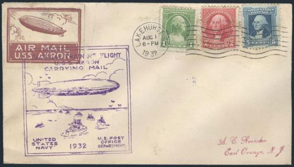 710, Tied by Lakehurst NJ 1 Aug, 1932 cancel on USS AKRON Dirigible Tactical Training Flight cover carrying mail. Has cachets on both front & reverse & with special illustrated USS Akron cinderella label affixed & tied. Addr to Roessler. F (Frost