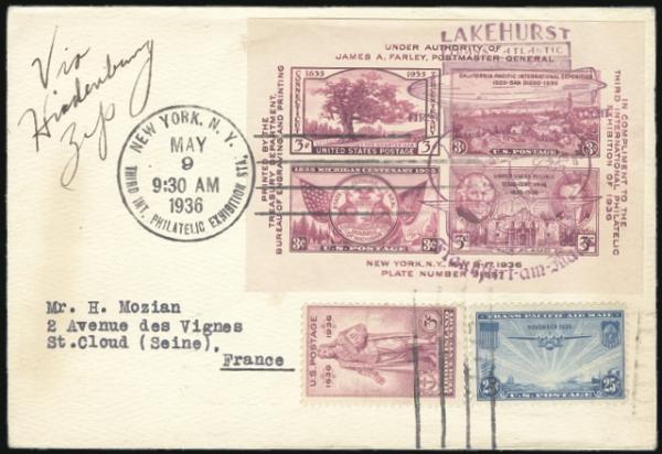 Tied on cach HINDENBURG cover by New York Tipex PO cancel for May 1936 Lakehurst-Frankfurt flight. Addr to France. F-VF (Image)