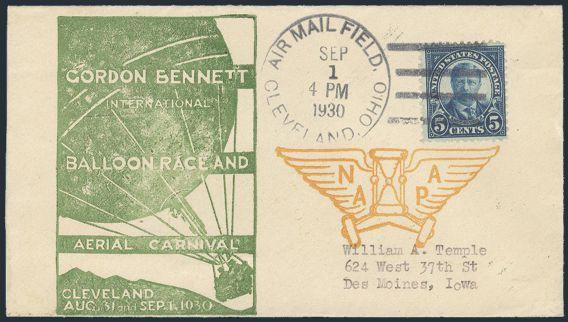 on Air Mail Field, Cleveland Ohio 1 Sept, 1930 cancel on cach cover for GORDON BENNETT BALLOON RACE & AERIAL CARNIVAL in Cleveland. VF (Image)