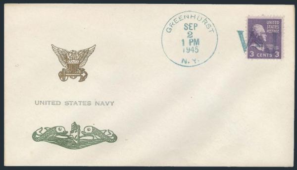 Each tied by green Greenhurst, NY / VJ 2 Sept 1945 duplex cancel for VICTORY DAY in JAPAN on 2 WWII unaddr Patriotic covers (diff cachets). F (Image)