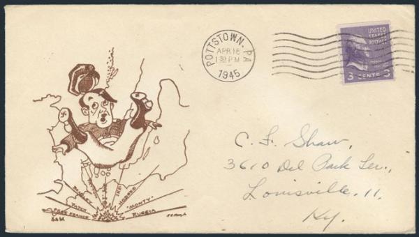 by Pottstown,Pa 16 Apr 1945 cancel on comic Anti-Axis WWII Patriotic cover to Louisville, Ky. Has Paul Miller cachet showing Adolf Hitler being blasted in the air above Map of Europe. F-VF (Image)