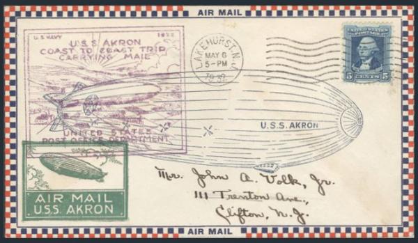 on triple cach USS AKRON Coast to Coast Mail Flight, Lakehurst to San Diego cover, May 1932. Also has full front blue illustration of the airship (Image)