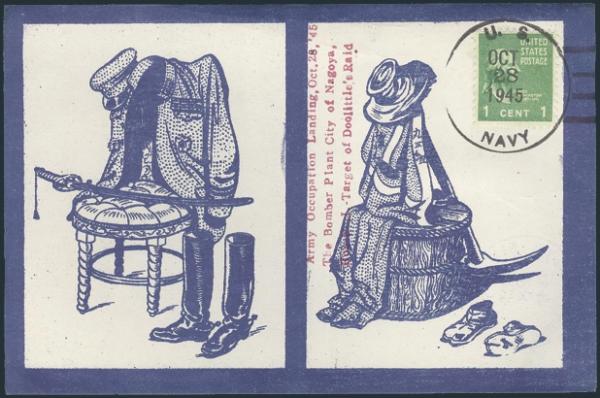 by US Navy 28 Oct, 1945 CDS on US Army Landing at Nagoya, propaganda card. Nagoya was the site of a WWII Bomber Plant. The card depicts a draped Japanese military uniform on one side & civilian clothes on the other. VF. Unusual item! (Image)