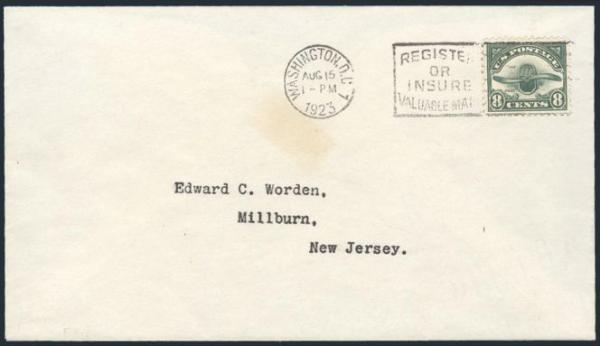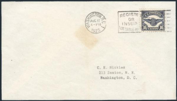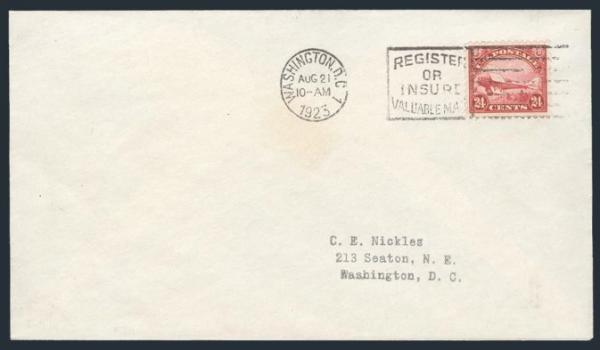 single neatly cancelled by Washington DC 21 Aug, 1923 slogan on FDC addr locally to C.E. Nickles. VF, light trivial age stain well away from the stamp. Cat $750