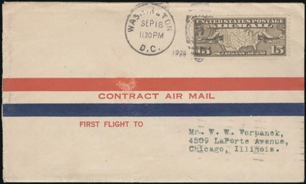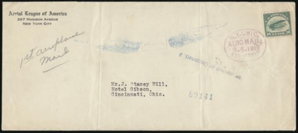 purple oval "N.Y. CHIC. / AEROMAIL / 9.5.1918 / FIRST TRIP" cach on #10 cover to Cincinnati. Has Aerial League of America, NY corner card. F, some creasing (AAMC #108)