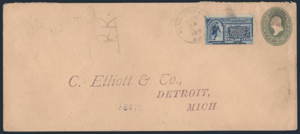 green Washington 2¢ postal stationery business reply envelope by DET. & GRU. HAV. / TR16 / RPO 28 Mar 1899 cancel to Detroit. F (Image)