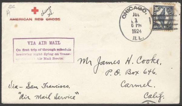 Chicago 1 July 1924 duplex cancel on cach Trans-Continental FFC "via San Francisco" to Carmel, Ca. Has Red Cross corner card. F, some TS on stamp (Image)