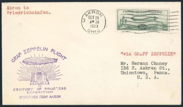 on cach GRAF ZEPPELIN Chicago Exposition Flight 28 Oct 1933 Akron to Friedrichshafen leg. Addr to Uniontown, Pa. VF (Image)