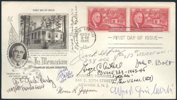 of the 2¢ Roosevelt tied on 1945 cach FDC from Warm Springs, Ga. The cover has been autographed by 8 diff notable WWII Air Force Pilots / Airmen. Incl GEORGE AXTELL (Fighter Ace & hero in Okinawa); MORRIS JEPSON (Hiroshima Atomic Bomb); JACOB