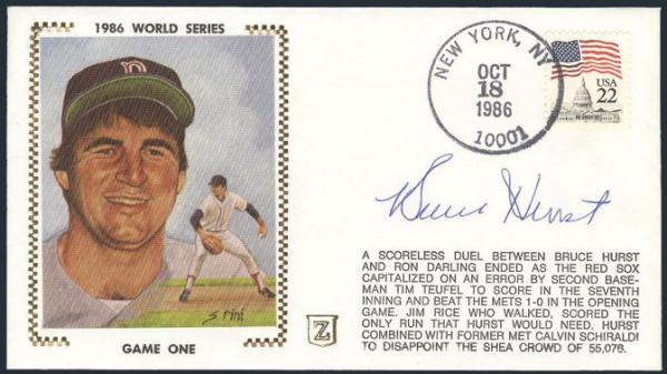 by New York, NY 18 Oct 1986 cancel on Zaso silk cacheted cover commemorating the 1986 World Series. Has been autographed by Red Sox pitcher BRUCE HURST. VF (Image)